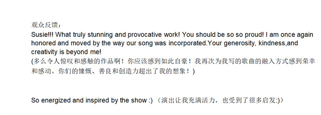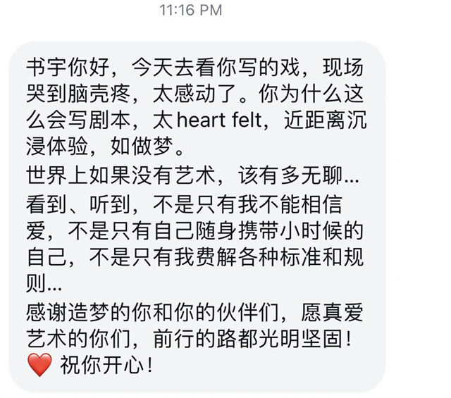 林书宇说,这部舞台剧就是自己的梦想。“和一些戏剧演员相遇很开心,我觉得舞台剧更要追求艺术的美,艺术要有社会责任感。我的梦想已经实现,这是我的第一部原创戏剧,对我来说获得满足感的方式很简单,那就是写的东西有人喜欢。收到这么多暖心的消息,外国观众的私信消息也很多。总体来看,观众中外国人很多,至少一半都是,有的场次外国观众更多一些,我觉得达到了英语剧本创作的目的,让更多外国人了解了我们的情况。”(本文图片由受访者提供)