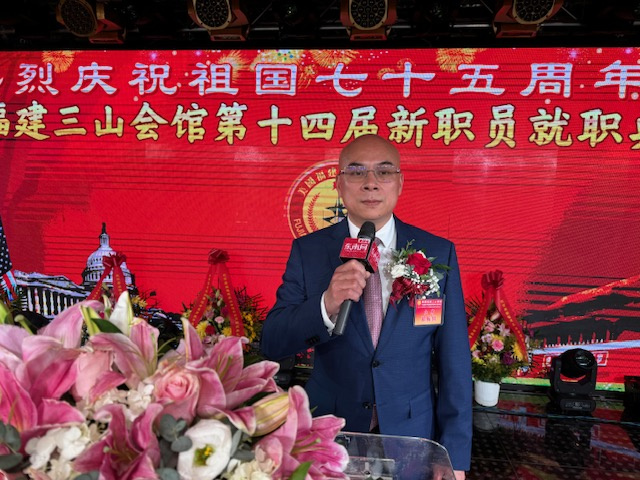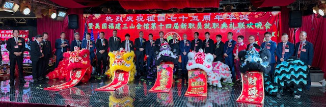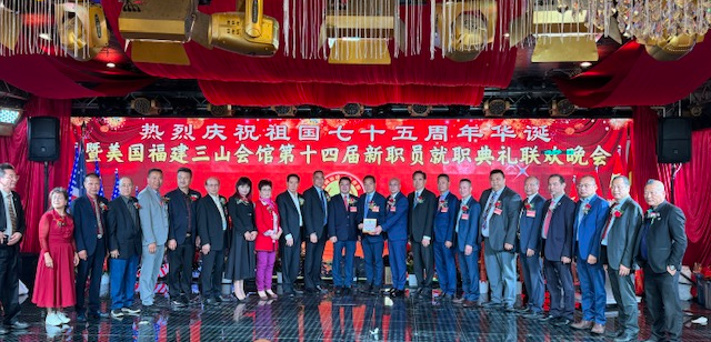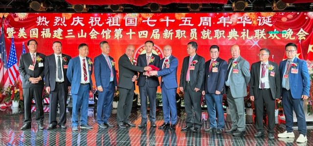 东南网10月5日讯(特约记者 纽约墨人)当地时间10月3日,美国福建三山会馆(以下简称“会馆”)在纽约举行庆祝新中国成立七十五周年联欢晚会暨第十四届新职员就职典礼。 中国驻纽约总领馆领侨处主任潘焱、领事邢玉临出席,与各界嘉宾一千三百余人欢聚一堂,共贺国庆。纽约市议员马泰也到场祝贺,并向会馆新任主席郑振何、前任主席潘木永颁发褒奖状。