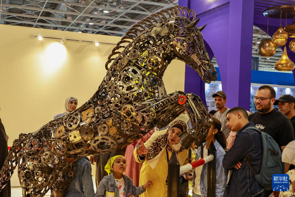 0月5日,人们在摩洛哥杰迪代马术节上观看金属马雕塑。