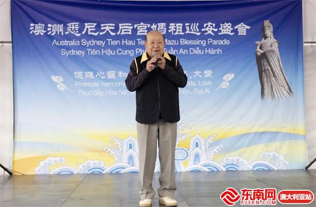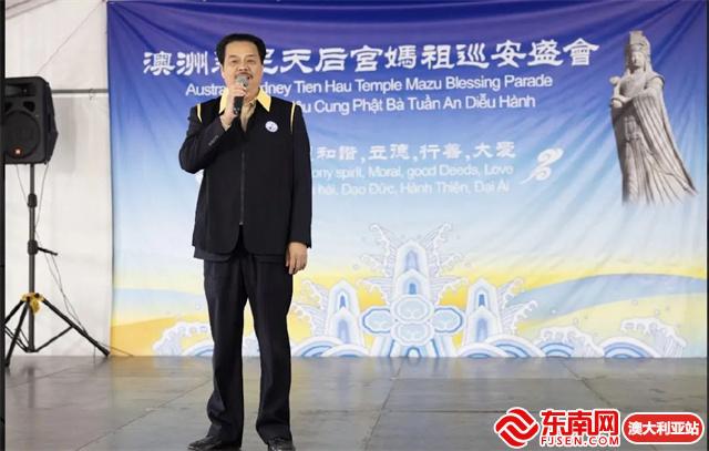 东南网10月28日讯(特约记者 一禾)当地时间10月12日,由澳大利亚华人联谊会、澳大利亚妈祖文化交流联合会、澳大利亚天后宫委员会联合举办的第四届南半球妈祖巡安活动在悉尼西区举行。澳大利亚天后宫委员会主席刁振谋,澳大利亚华人联谊会会长吴贵光,澳中工商联合会主席苏鑫峰,澳大利亚国际文化产业协会主席杨志唯,新南威尔士州议员大卫·萨利巴,澳大利亚莆田商会会长戴秉凡、名誉会长黄幼昱,澳中茶文化交流促进联合总会会长吴雷蒙,澳大利亚东方歌舞团团长郑丽莉,澳大利亚国际文化产业协会副主席杨洋及悉尼各界代表等数百人参加活动。