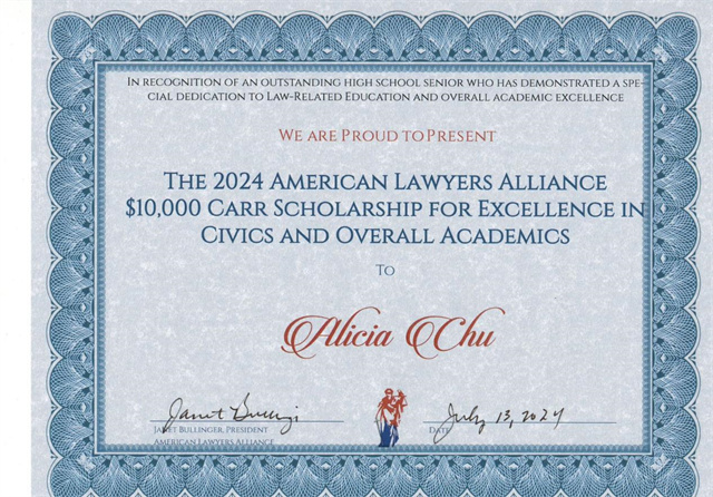朱诗雨获得美国律师协会大奖。(郑颖瑜供图)