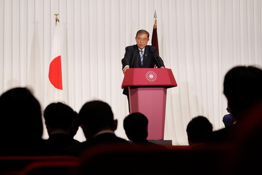 10月28日,日本首相、自民党总裁石破茂在日本东京自民党总部举行的记者会上讲话。新华社发(Pool图片,金敬勋 摄)