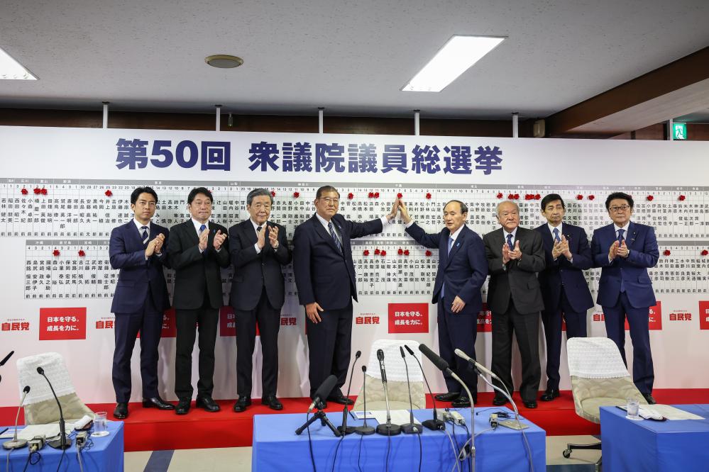 10月27日,在日本东京自民党总部,日本首相、自民党总裁石破茂(左四)和其他自民党成员一同将象征成功当选的红花贴在候选人名字上。新华社发(Pool图片,青山隆史 摄)