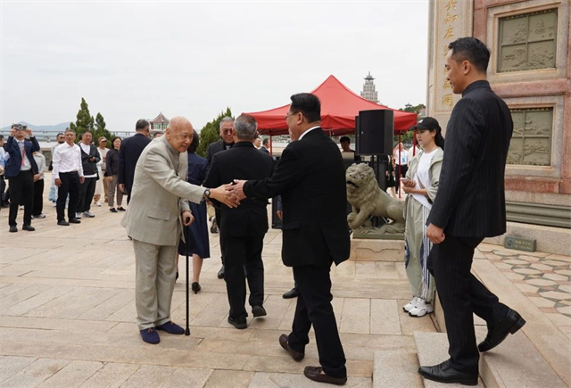 10月21日,全国侨联系统和海外侨胞向陈嘉庚陵园敬献花篮仪式在厦门市集美区鳌园举行。图为陈嘉庚长孙陈立人向前来献花的人士表示感谢。