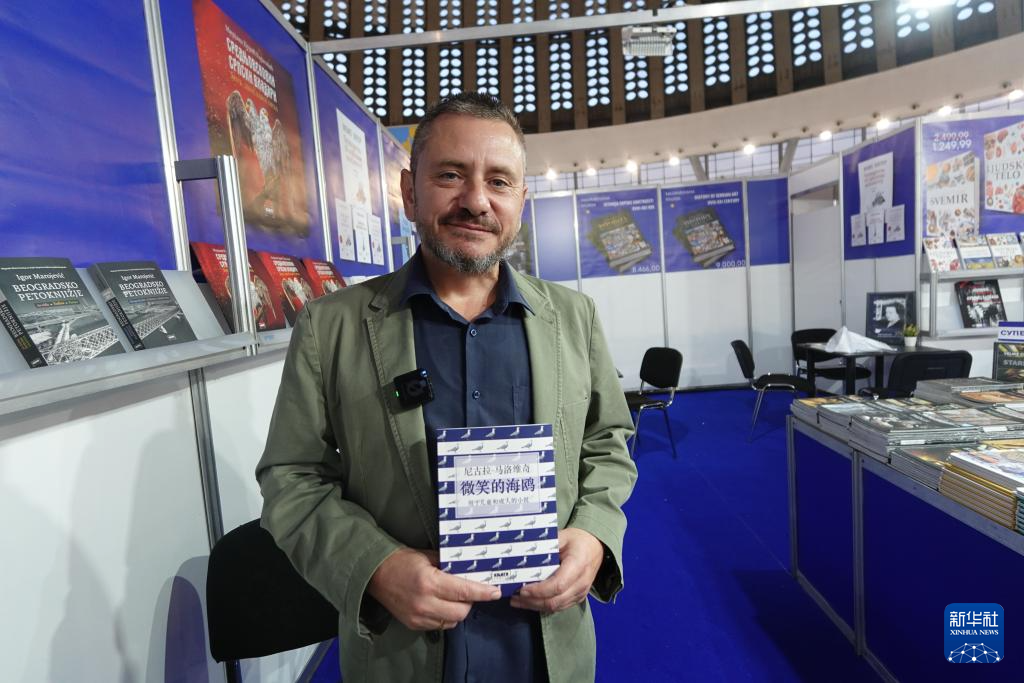 10月26日,在塞尔维亚贝尔格莱德的第67届贝尔格莱德国际书展上,来自黑山的作家尼古拉·马洛维奇展示其作品《微笑的海鸥》中文译本。新华社记者 陈颖 摄
