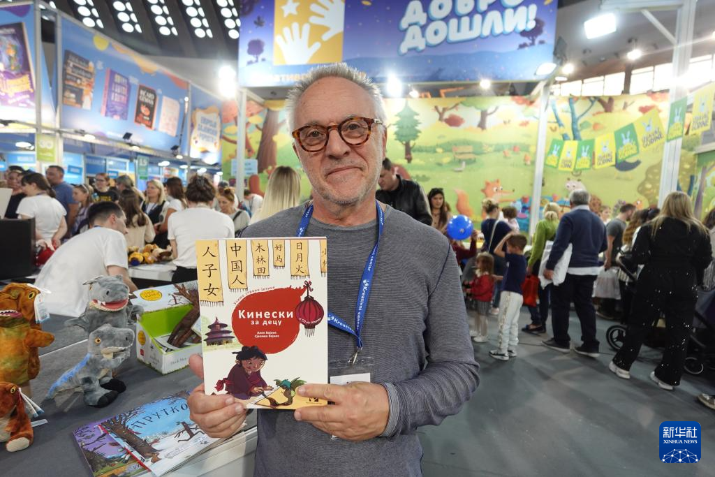 10月26日,在塞尔维亚贝尔格莱德的第67届贝尔格莱德国际书展上,本届书展“最佳出版商”奖获得者、塞尔维亚知名童书出版社“创意中心”执行经理贝戈维奇展示由该出版社出版的汉字启蒙书。新华社记者 陈颖 摄