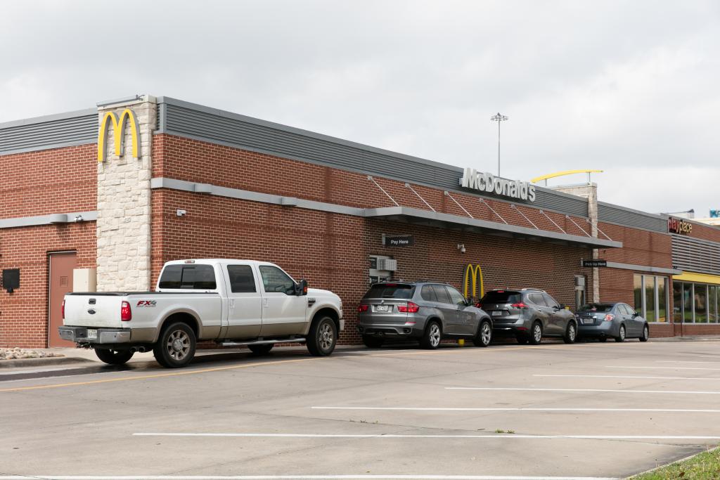 2020年3月19日,位于美国得克萨斯州达拉斯北郊的一家麦当劳门前,人们开车排队等候点餐服务。新华社发(田丹 摄)