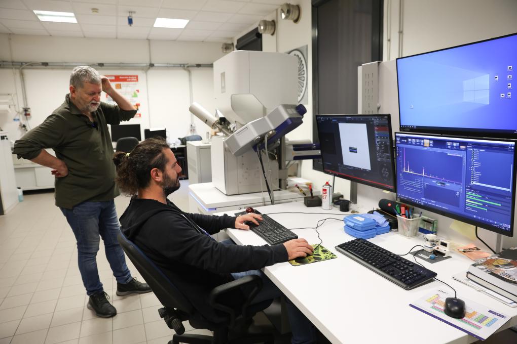 11月6日,意大利帕多瓦大学文化遗产学院教授马西莫·维达莱(左)与研究人员在实验室讨论青铜狮样本检测分析过程。新华社记者 李京 摄