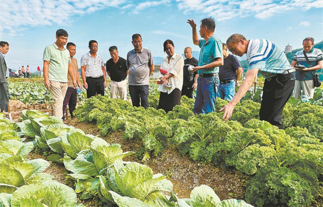 On the 10th, the Xiamen Farmers' Study and Inspection Activity in Sanming was jointly initiated and organized by the Xiamen Fruit Association and the Xiamen Jimei District Fruit and Vegetable Economy Promotion Association. More than 20 fruit farmers, flower farmers, vegetable farmers and professional growers from Jimei, Tong'an and other districts of Xiamen City visited Sha County in Sanming to visit the modern agricultural industrial park and gain a deeper understanding of the new varieties, technologies and breakthroughs in the fields of rice, flowers, fruits and vegetables in the local area. It is reported that this is the first folk learning and inspection activity initiated by the Folk Fruit and Vegetable Association between the two places with farmers participating spontaneously. The picture shows Xiamen farmers studying the modern vegetable industry in Shaxian.(Photo by Wang Wenjin from Fujian Daily)