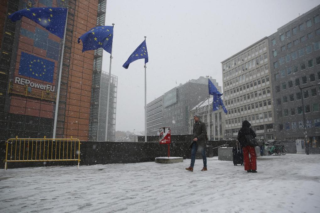 1月17日,在位于比利时布鲁塞尔的欧盟总部附近,人们冒雪出行。新华社记者 赵丁喆 摄