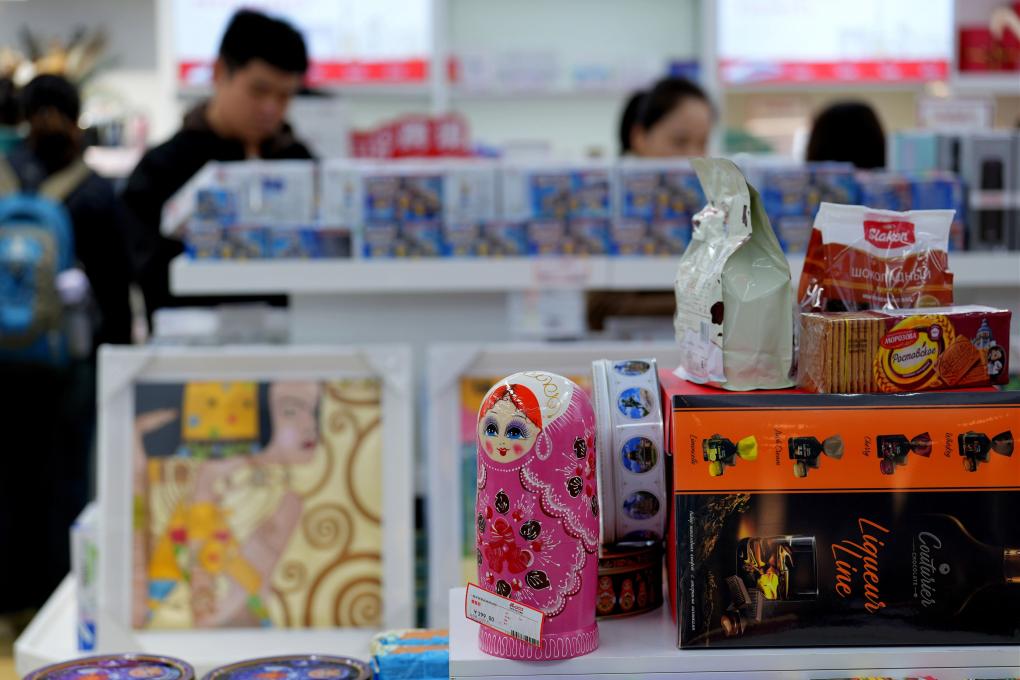 11月17日,旅客在湖北汉口车站中欧班列进口商品保税店选购商品。新华社记者 邢广利 摄