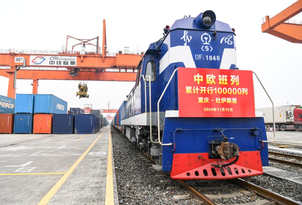 11月15日,第10万列中欧班列——X8083次中欧班列(重庆—杜伊斯堡)在重庆团结村中心站准备发车。新华社记者 王全超 摄