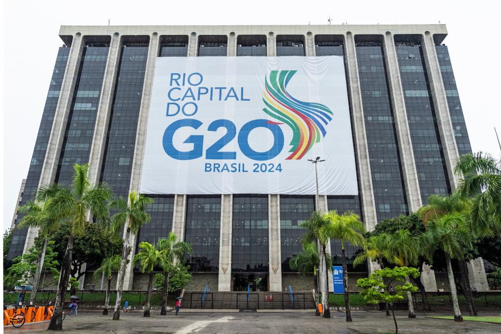 这是11月16日在巴西里约热内卢市政府行政中心外拍摄的二十国集团领导人峰会标识。二十国集团(G20)领导人第十九次峰会将于11月18日至19日在巴西里约热内卢举行。(新华社记者 王天聪 摄)