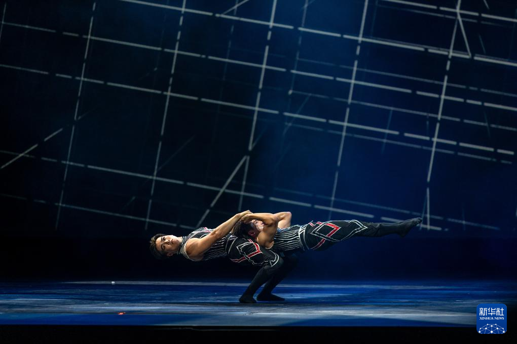 11月22日,在希腊雅典举行的第二届中希国际戏剧节上,广州杂技团演员表演杂技《男子对手-力量》。新华社发(马里奥斯·罗洛斯摄)