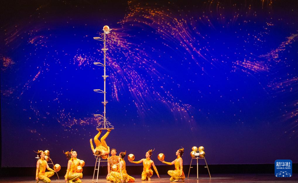 11月22日,在希腊雅典举行的第二届中希国际戏剧节上,广州杂技团演员表演杂技《球技-金色畅想》。新华社发(马里奥斯·罗洛斯 摄)