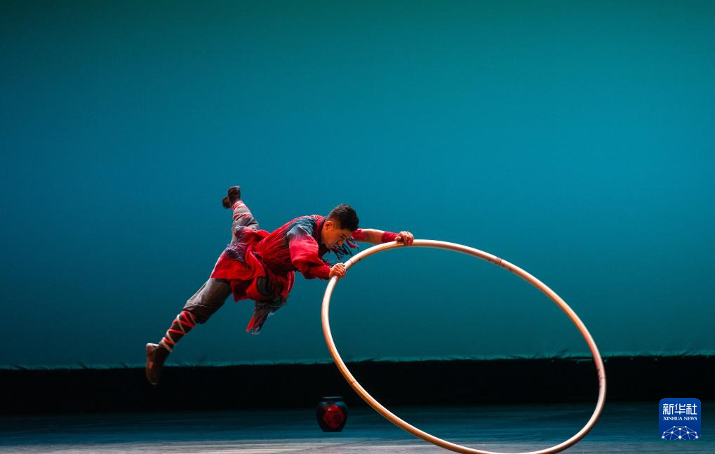 11月22日,在希腊雅典举行的第二届中希国际戏剧节上,广州杂技团演员表演杂技《滚环-酒中侠》。新华社发(马里奥斯·罗洛斯 摄)