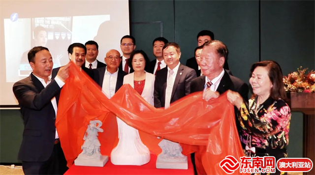 当晚还举行了“澳大利亚妈祖文化园”启动仪式,在现场嘉宾的共同见证下,莆田市湄洲妈祖祖庙董事会常务副董事长庄美华、澳大利亚MAXIMS BUILDING 集团董事长林宝筠OAM缓缓揭下妈祖像上的红布,为文化园揭幕。