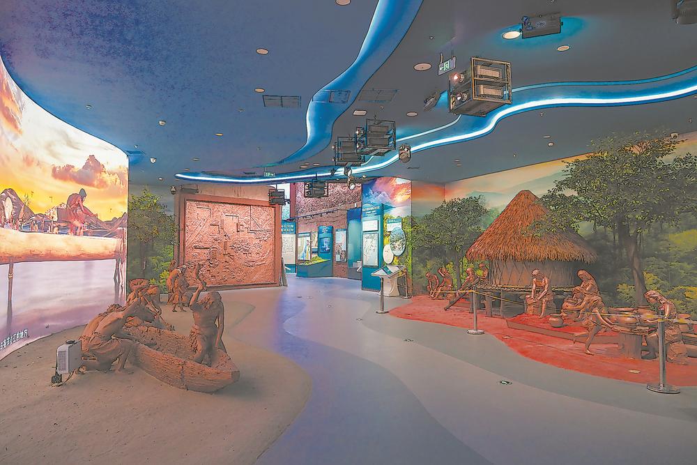 展厅中的超大曲面屏及先民雕塑,展示早期南岛语族聚落的生活场景。江信恒 摄