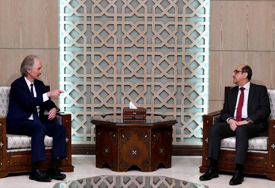 11月24日,在叙利亚大马士革,联合国秘书长叙利亚问题特使裴凯儒(左)与叙利亚外交和侨民事务部长萨巴格会晤。新华社发(阿马尔·萨法尔贾拉尼 摄)