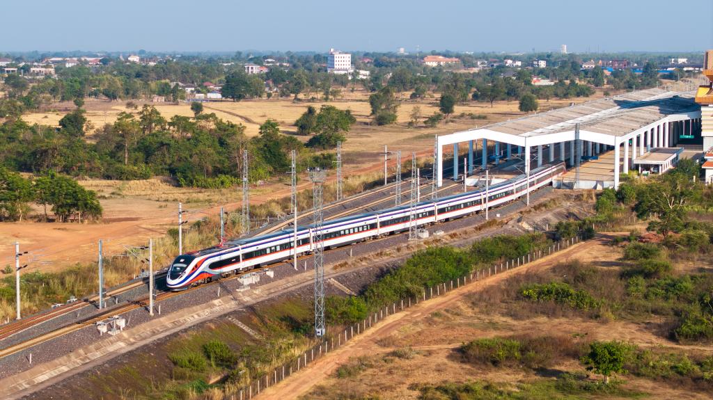 12月2日,在老挝万象,“澜沧号”动车组缓缓驶离中老铁路万象站站台(无人机照片)。新华社发(凯乔 摄)