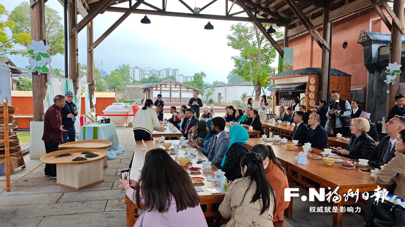 福州茉莉花茶窨制工艺有近千年历史,2014年入选国家级非遗项目,2022年被列入联合国教科文组织人类非物质文化遗产代表作名录。“茉莉花茶,茶为身,花为体,一层花一层茶,重重叠叠。看一眼外形,颜值担当不足为奇;闻一下香气,缕缕清香怦然心动!”从业近40年的茉莉花茶窨制工艺传承大师张子建,一边手握竹筛轻轻摇晃花茶,一边向国际友城嘉宾介绍茉莉花茶“平抖蹚拜烘窨提”等工序。伴随着动人的旋律,身着中式旗袍的茶艺师演绎精湛的泡茶技艺,邀请嘉宾品尝茉莉花茶。嘉宾们端起茶杯轻轻品茗,赞不绝口。