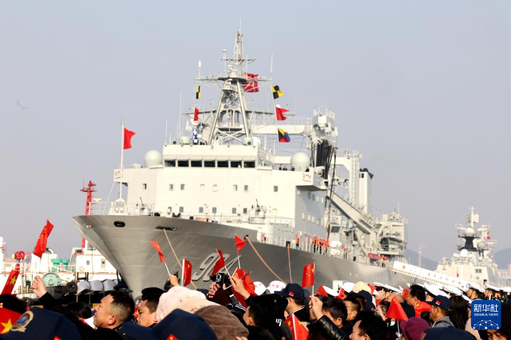 上午9时许,伴随着嘹亮的军乐声,编队舰艇依次解缆,缓缓驶离码头。甲板上,任务官兵整齐列队,向祖国和亲人挥手告别。