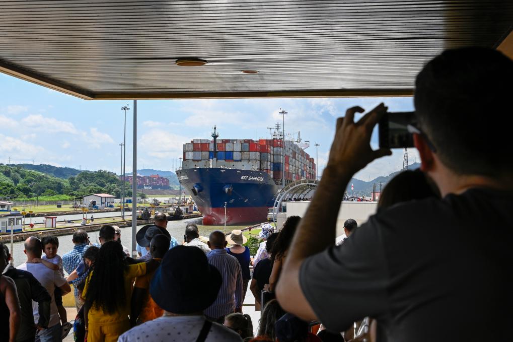 8月28日,在巴拿马首都巴拿马城附近,游客在巴拿马运河的米拉弗洛雷斯船闸游客中心观看货轮通过船闸驶入太平洋。新华社记者 李木子 摄