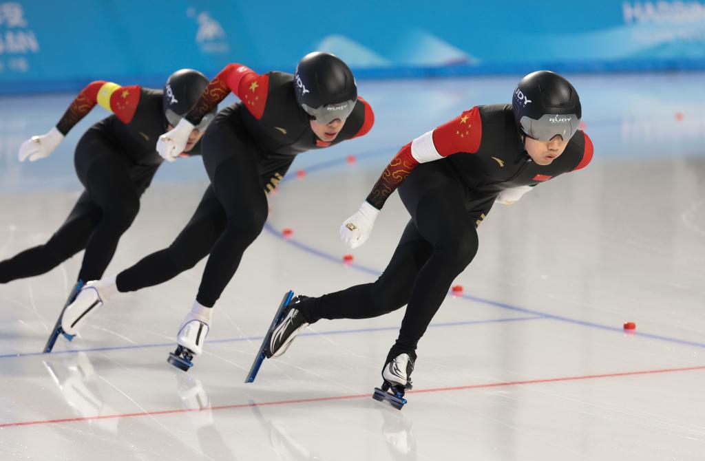 2月10日,中国队选手高亭宇(右)、宁忠岩、廉子文(中)在比赛中。当日,第九届亚冬会速度滑冰男子短距离团体追逐赛在哈尔滨举行。中国队获得冠军。新华社记者 吕帅 摄