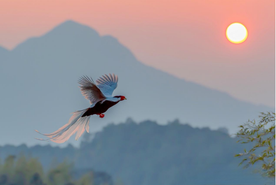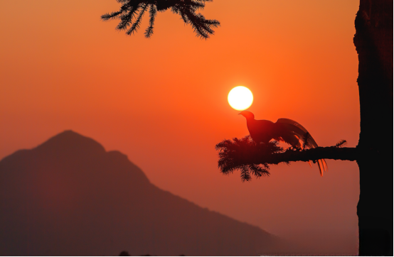 In the New Year, the orange-red sunset, the elegant flying and the dreamy mountains were set off against each other at the bird watching spot of She ethnic group, Qingshui She Nationality Township, Yongan City, forming a beautiful picture full of poetry and philosophy.