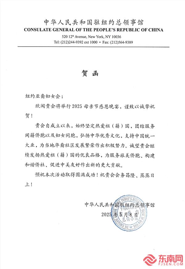 东南网5月9日讯(特约记者 纽约墨人)当地时间5月8日,美国纽约亚裔妇女会(以下简称“妇女会”)在纽约举办庆祝2025母亲节感恩晚会活动。中国驻纽约总领馆领事向裕韬、荣顶,美国国会议员孟昭文代表,纽约州参议员刘醇逸代表、众议员金兑锡代表,纽约市议员马泰代表,妇女会主席陈云,妇女会执行主席林瑜,妇女会第一常务副主席卢美超,妇女会理事长池玉莺,妇女会秘书长王丽芳、黄KayIe(音译:凯莉)以及美国福建同乡会主席陈恒,美国福建公所主席郑德良,美国福建会馆主席陈昭银,美国福建三山会馆主席郑振何,美国长乐社团联盟总召集人陈书圣,美国梅花同乡会主席郑师飞,美国纽约华人联合会主席陈继华等出席活动。活动由林利锋主持。