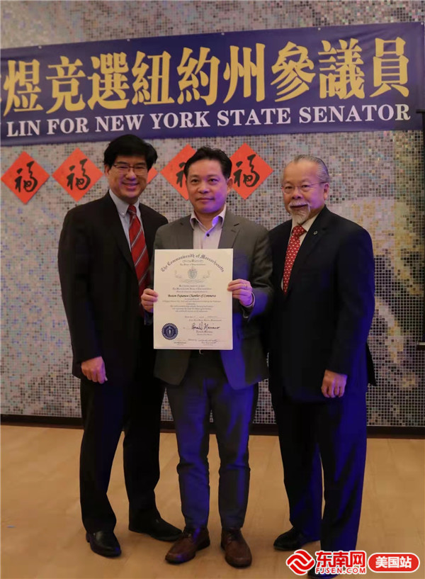 东南网美国2月11日讯(本网特约记者 白水 文/图)当地时间2月9日,美国波士顿福建总商会在波士顿昆西金源大酒楼举办"迎新春宴"暨支持林煜竞选纽约州参议员筹款晚宴,麻州众议员黄子安、陈德基以及当地侨、商界代表120余人参加活动,场面喜庆、温馨、热烈。