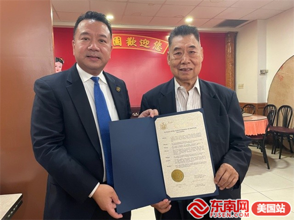 纽约州众议员牛毓琳代表陈键榕与美国福建公所楼业董事会董事长杨功德合影。