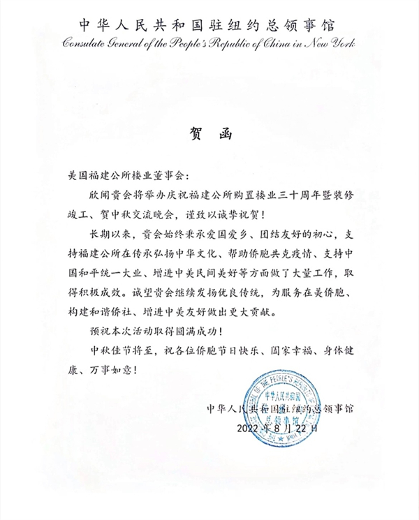 美国福建公所秘书长曾贤秋致谢词,常务副主席张云宣读国际欧亚科学院院士赵新力贺电,常务副主席郭尔强宣读北京市归国华侨联合会、福建省外事办公室贺电。晚会由美国福建公所常务副主席林琦龙主持。会后,美国福建公所楼业董事会向曾贤秋、郑桂清、林琦龙、张君龙颁发2022杰出工作者奖。晚会由中华歌舞团表演、湖南同乡会原主席陈泰行赞助。参加当天活动的嘉宾有联合国世界瑜伽协会主席迪利普库马尔·谢帕潘(Dileepkumar Thankappan),美东华人社团联合总会秘书长林学文,美国福建公所主席郑德良,纽约市长亚裔事务主任郑祺蓉,纽约州众议员牛毓琳代表陈键榕,纽约市议员马泰、代表黄华清,美国华人共和党联盟主席苏丽凰代表王惠文,联合国妈祖中华文化发展基金会执行会长、美国时代广场全球直播间总裁林泳莉,亚美总商会会长陈善庄等。