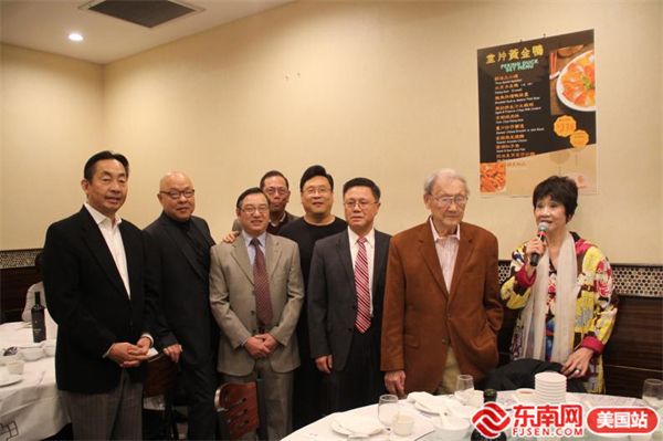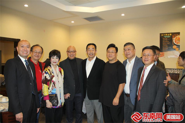 新泽西华人联合总会主席林洁辉、严欣铠伉俪(右一、二)带领共同主席(右三起)洪利武、佟卫东、李世群、郭瑞尧、王恒、梁智参会