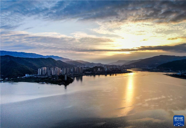 落日余晖下的重庆开州区汉丰湖景色(10月18日摄)。