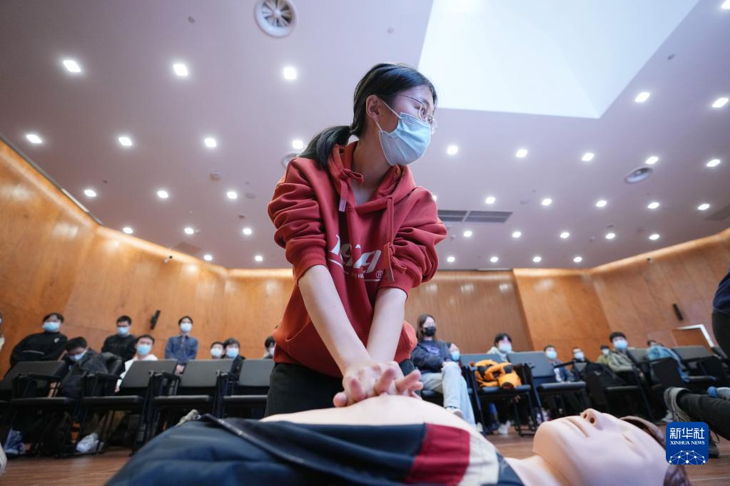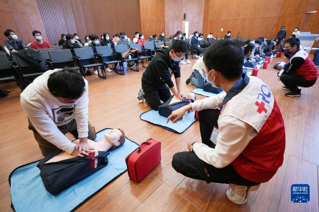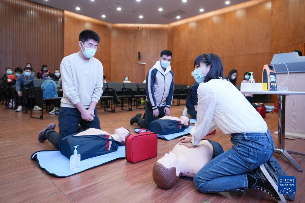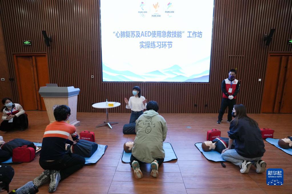 11月28日,冬奥学生志愿者在急救技能培训上学习心肺复苏术。新华社记者 鞠焕宗 摄