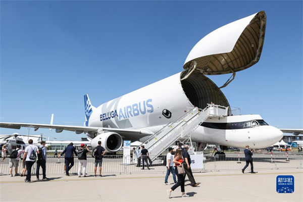 6月22日,在德国首都柏林南郊,人们参观一架展出的空中客车“大白鲸XL”运输机。