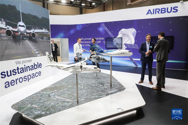6月22日,在德国首都柏林南郊,人们在空中客车公司展区交谈。