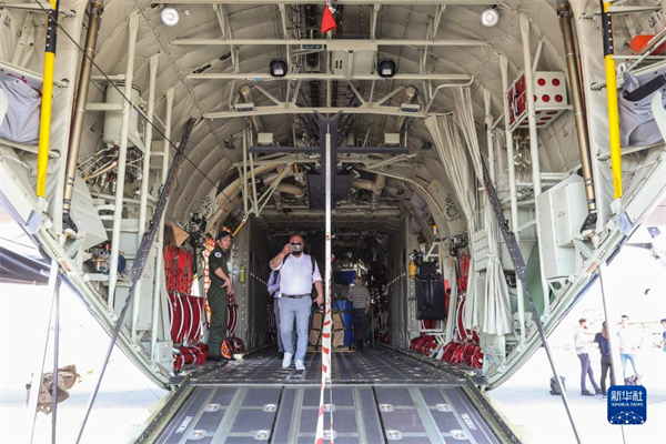 6月22日,在德国首都柏林南郊,人们在一架展出的C-130J“超级大力神”军用运输机内参观。