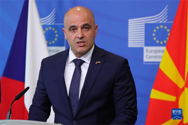 7月19日,在比利时布鲁塞尔,北马其顿总理科瓦切夫斯基在记者会上讲话。