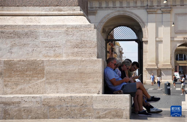 8月2日,在意大利罗马的人民广场,游客在阴凉处乘凉。