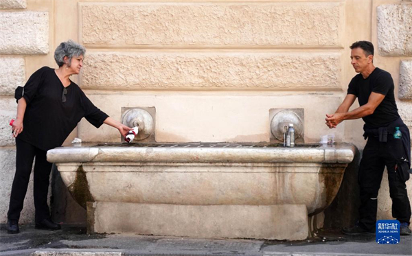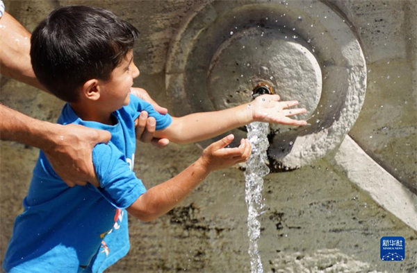 8月2日,一名男孩在意大利罗马西班牙广场的喷泉玩水。