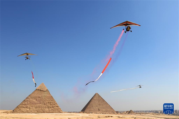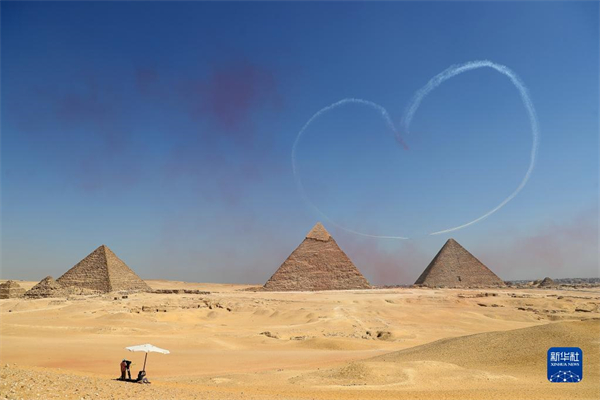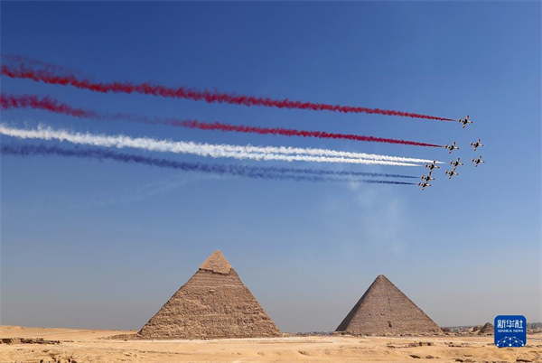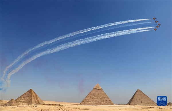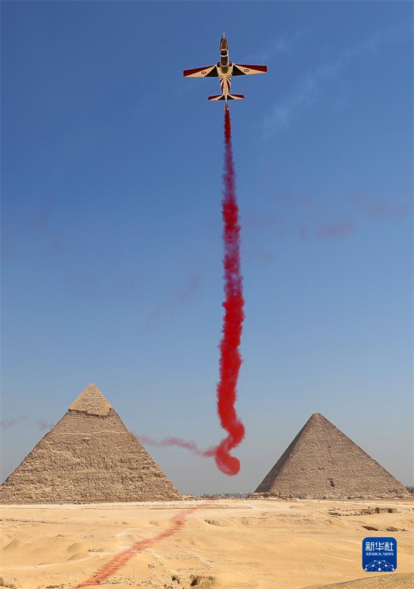 当日,埃及2022金字塔航空表演在吉萨金字塔景区举行,来自埃及和韩国的多个飞行表演队伍进行了多项精彩的飞行表演。