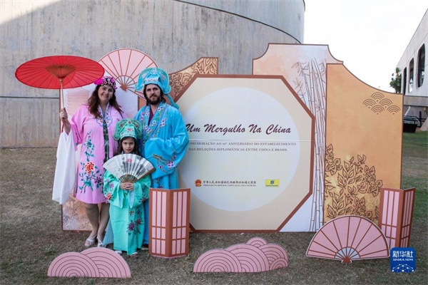 8月13日,在巴西首都巴西利亚举办的“中国一瞬”文化体验周活动上,人们体验京剧服饰。