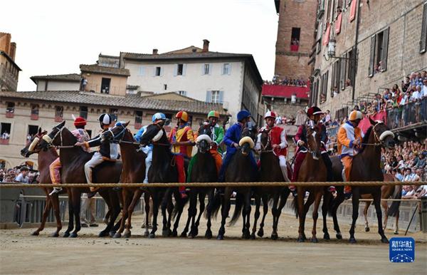 8月15日,骑手在意大利锡耶纳田野广场上参加赛马节热身赛。