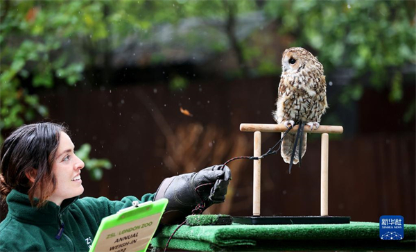 8月25日,在英国伦敦动物园,工作人员为一只猫头鹰称重。