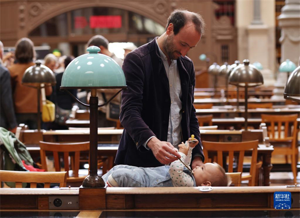 9月17日,一对父子在法国国家图书馆黎塞留馆内参观。