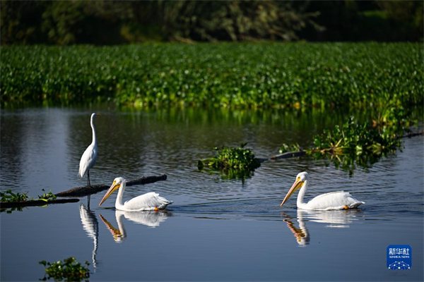 这是在墨西哥首都墨西哥城霍奇米尔科生态公园拍摄的鹈鹕和白鹭(2022年11月2日摄)。