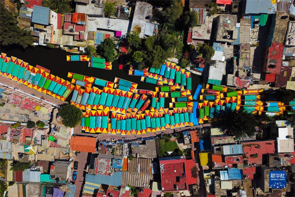 在墨西哥首都墨西哥城霍奇米尔科,游船停泊在运河内(航拍照片,2020年10月23日摄)。
