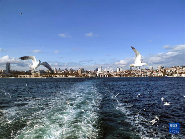 11月27日,海鸥在土耳其博斯普鲁斯海峡的水面上觅食。